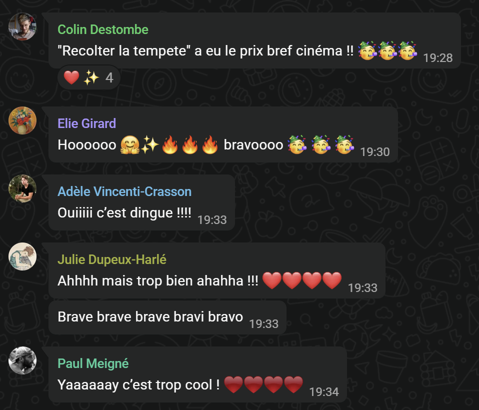RĂ©colter la tempĂȘte a donc reçu le prix BrefcinĂ©ma, et grande est notre gratitude, bombĂ©e est notre fiertĂ©, gonflĂ©s sont nos crĂ©dits sur la plateforme FilmFest, pour Ćuvrer Ă diffuser le film encore plus loin ! Merci BrefcinĂ©ma đ± et bravo, encore, Ă toustes celleux qui ont contribuĂ© Ă façonner ce film đ